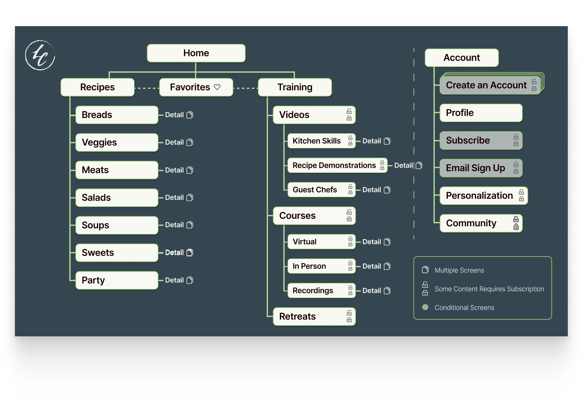 Our fundamental structure that was guided and influenced by generative research and the journey map. This foundation served as our map for the interactive prototype and provided clarity on how the app is organized.